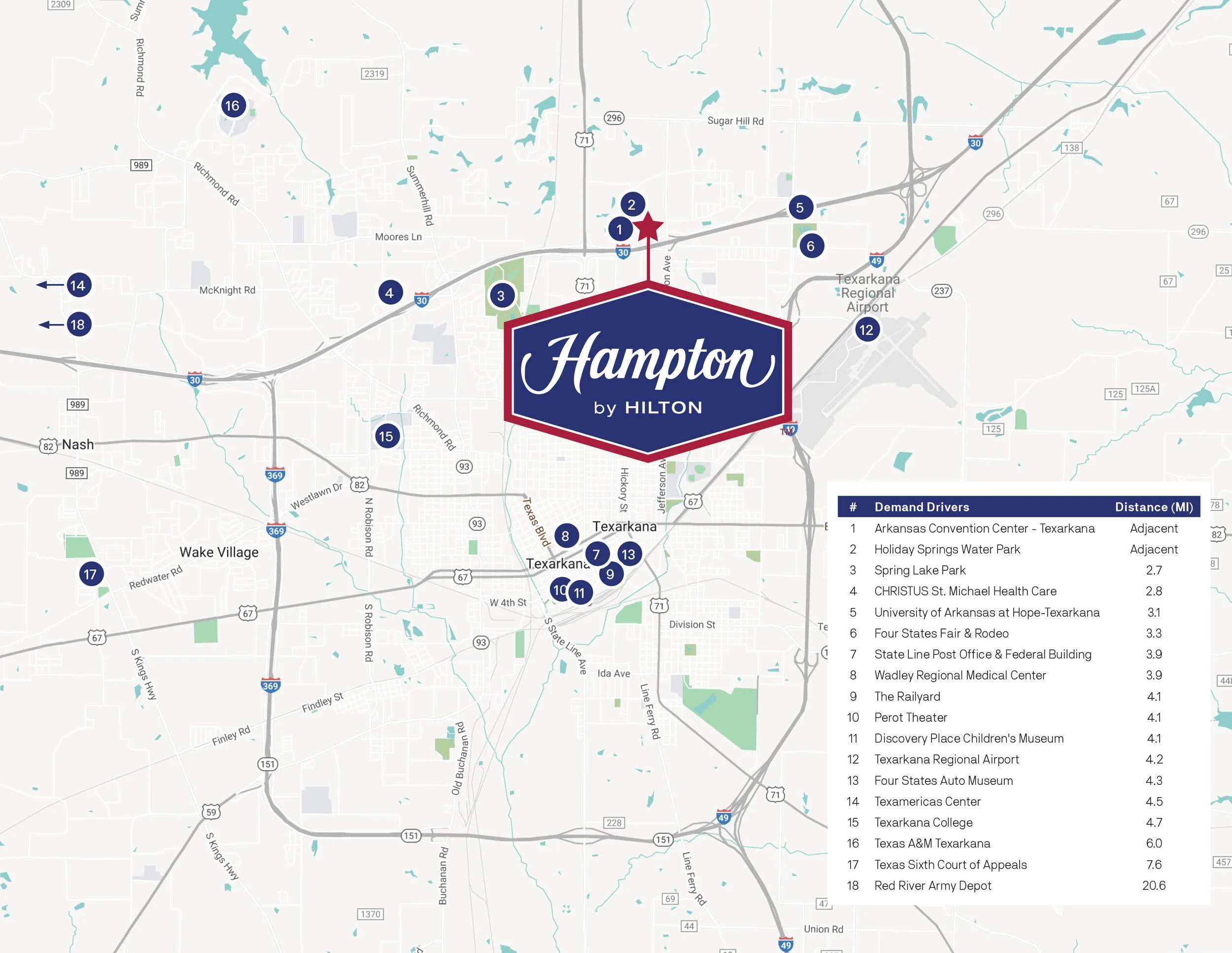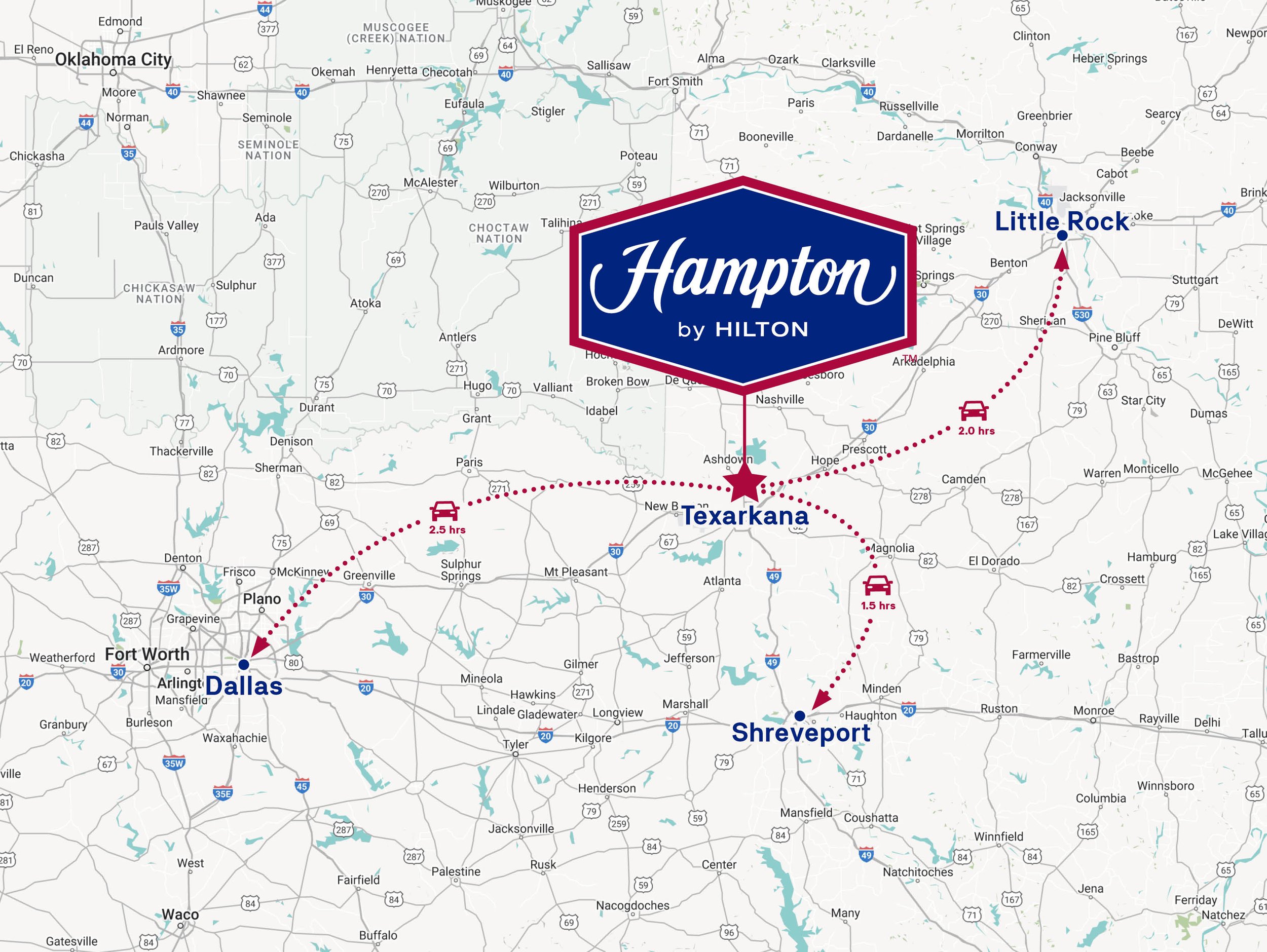 The Hotel benefits from its proximity to a range of both corporate/group and leisure/transient demand generators. Just four miles north of Downtown Texarkana, the Hotel is within walking distance to the Arkansas Convention Center - Texarkana and the Holiday Springs Water Park, and is a short drive to the top leisure attractions such as the Federal Courthouse Building (said to be the most photographed courthouse in the country), the Four States Auto Museum, Spring Lake Park, and many more.
